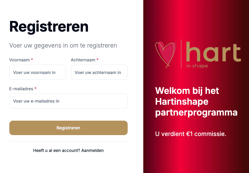 Registreer je via ons partnerplatform met je naam en e-mailadres. De aanmelding is gratis en binnen enkele minuten geregeld.